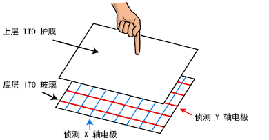 上層ITO膜受壓并接觸到下層玻璃時(shí),電傳導(dǎo)會(huì)偵測(cè)接觸的區(qū)域。